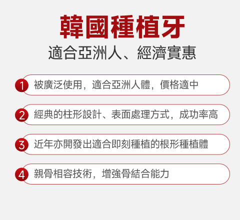 配備韓國進口數字化CT,精準定位植牙。配備國際知名種植系統,各型號植體與愈合基臺、滿足顧客不同需求的種植修復。